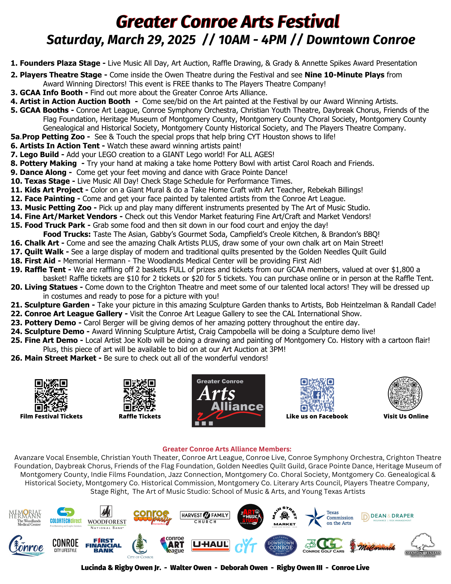 The Greater Conroe Arts Alliance, made up of 21 Arts organizations in Montgomery County Texas which represent the Performance, Visual, Literary, and Cultural Arts, is hosting its Annual Greater Conroe Arts Festival on Saturday, March 29, 2025 from 10 a.m. to 4 p.m.